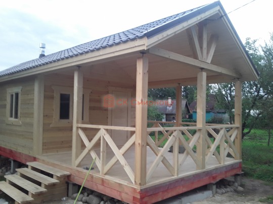 Обратите внимание на столбы, установленные на террасе: они закреплены на домкраты. Это делается для того, чтобы после усадки (а она будет даже при стройке из сухого бруса) можно было выставить нужный уровень. Это предотвратит перекосы крыши — всё продумано.