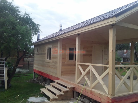 Баня установлена на забивные железобетонные сваи. Фундамент также делала наша специальная бригада монтажников. Стоимость монтажа свай под ключ вышла на уровне свайно-винтового фундамента.