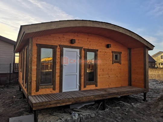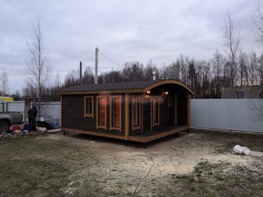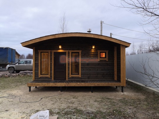 Можно выделить несколько особенностей проекта: терраса, округлая крыша, панорамные стеклопакеты, скамейки с откидными крышками, электропроводка, дизайнерская люстра. Мы строим бани-дома каркасной сборки с утеплением под ключ с полной отделкой снаружи и внутри.