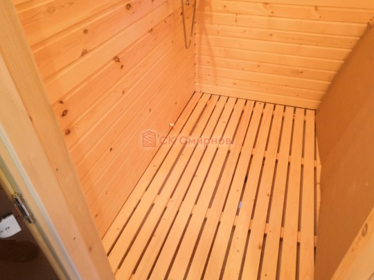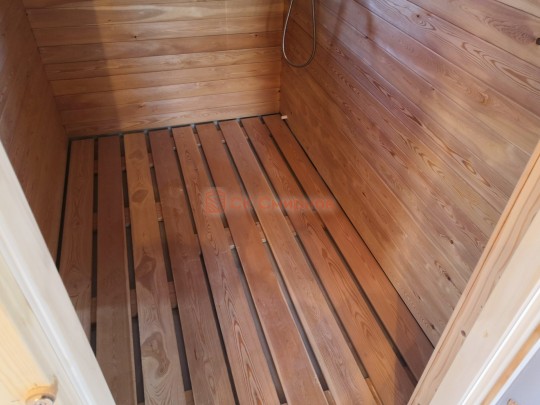 В комнате для приема душевых процедур на полу устанавливается душевой пластиковый поддон который имеет слив на улицу. В поддоне лежит деревянный трапик для удобства.