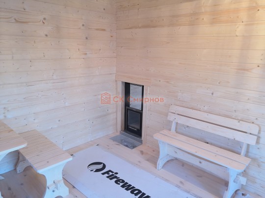В комплект бани входит стол и две скамейки из доски 19мм, как на фото. Есть комплекты из более толстой доски а также из кедра, смотрите в доп комплектации.