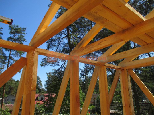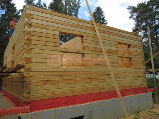 Из профилированного сухого бруса 9х14см, 14х14 см или 14х19 см. Сборка сруба в теплый угол на нагеля или гвозди 200 мм со сверлением отверстия в верхнем брусе (в зависимости от вида бруса).